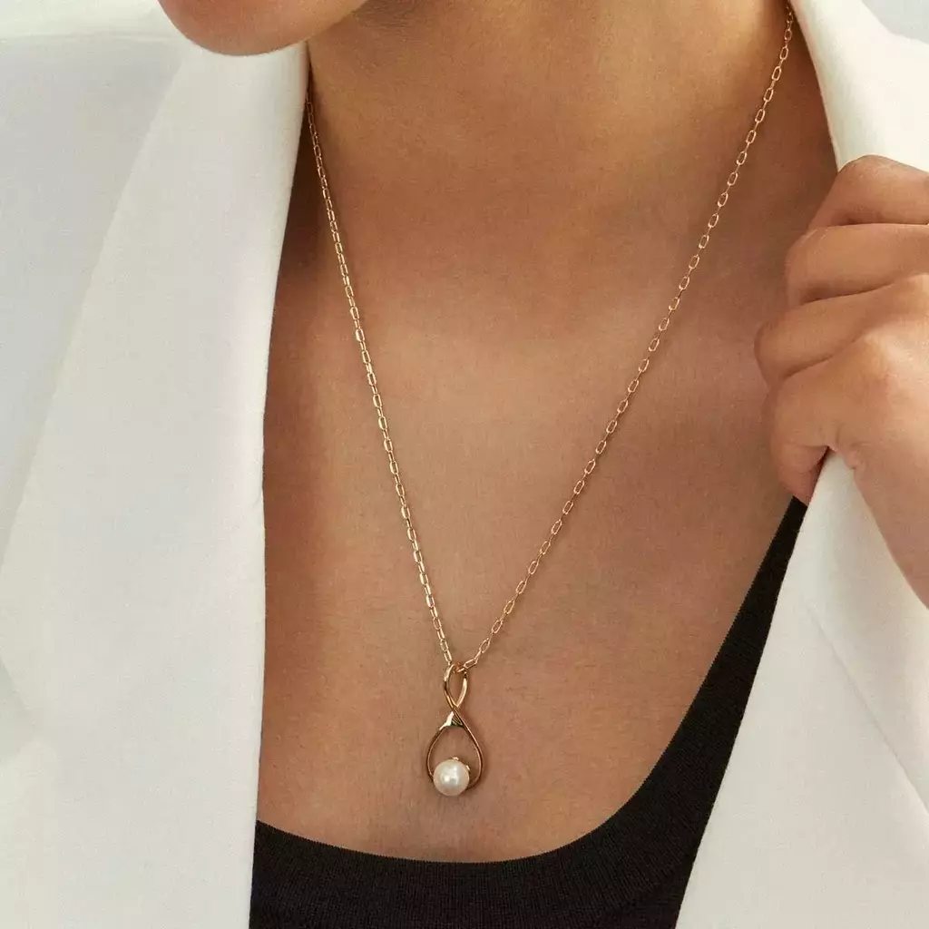 Colar com pingente em formato de gota vazado com pérola Shell (redonda). Possui corrente de elos pequenos retamgulares.