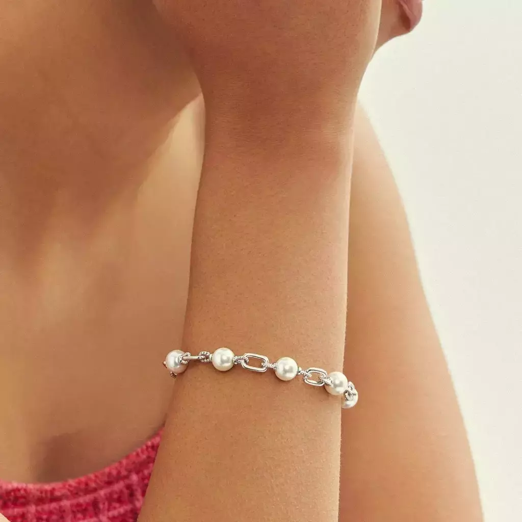 Pulseira de elos ovais vazados, interalados com pérola shell (redonda).
